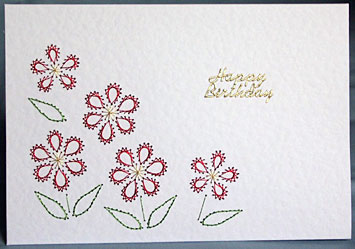 A hammered white double fold greetings card is embroidered with daisies using red, gold and green metallic thread. A gold Happy Birthday sticker completes the design. This pattern can also be stitched on parchment with the petal and leaf shapes embossed.