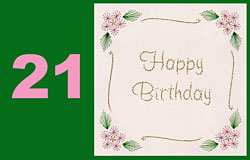 The second version of the PinBroidery flower corners pattern is stitched complete with the Happy Birthday greeting. This is mounted on dark green greetings card with the number 21 cut from pink paper. The type face used for the number is Arial Black. This was printed as an outline font as a guide for cutting.