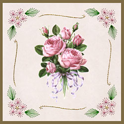 The first one has been stitched without the words Happy Birthday. It is mounted on a gold greeting card. Rose clip art has been added to the center.